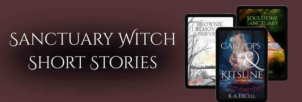 While I’ve done my best to make sure you can read the Sanctuary Witch short stories in any order without overwhelming confusion, Cakepops and Kitsune does touch on events that occurred during last year’s holiday short story, Brownie Removal Service. As such, I am gifting you all of the Sanctuary Witch short stories. Here is the publication order:
